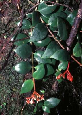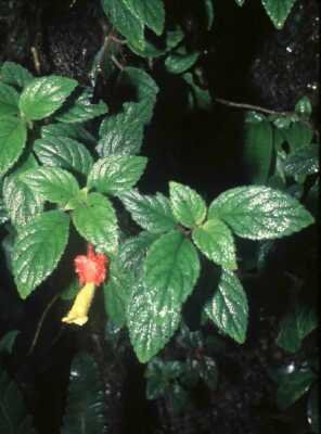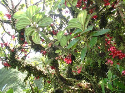 The beautiful moss-laden mountain fuschia, Charianthus nodosus, of the family Melastomataceae and endemic to Martinique, on Mt. Pelée.