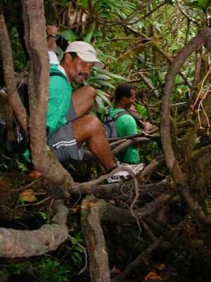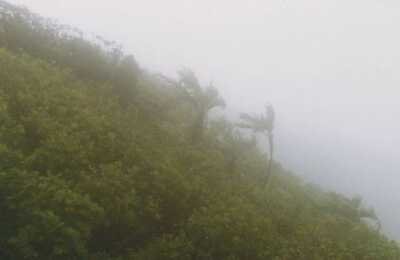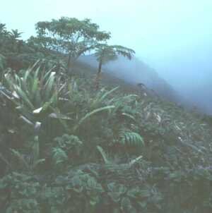 A low, impenetrable thicket of dwarfed, gnarled trees found on wind-swept, cloud-shrouded, mountain summits. As the picture at right (Morne Diablotin, Dominica) shows, the path is in the trees and one must climb along the dwarfed trunks of kaklen (Clusia mangle). Trunks and branches are covered with festoons of mosses and liverworts. Epiphytes and small climbers abound and a luxuriant herbaceous ground layer may be present. Leaves may be scorched by the constant wind. Several endemic species may be found in this community. Typical trees include Clusia and Charianthus spp. Also known as Mossy Forest as well as cloud forest although the latter may not be stunted and can refer to any woodland community enshrouded in mist.