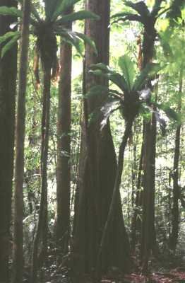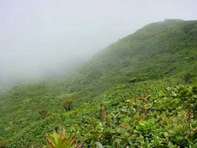 This forms the transition between the rainforest of mid-elevations and the elfin woodland of the summit. The main canopy is 20-30 m high and trunks are mossy but otherwise free of epiphytes. Dominant trees include bois bandé (Richeria grandis) and the gymnosperm, Podocarpus coriaceus.