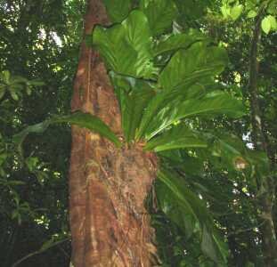 The rainforest of the Caribbean islands is known as the Dacryodes-Sloanea association after the two dominant trees (photos below) of the principal canopy. It is also known as submontane rainforest. The forest comprises an upper closed canopy 30 m  high, a discontinuous middle tree layer at 20 m and a low storey of small trees at 10 m.Gommier (Dacryodes excelsa) is the dominant tree and is joined in the uppermost layer by, among others, several species of chataignier ( Sloanea spp.) with their large plank buttress roots. Bois côte (Tapura antillana) is the commonest tree of the middle layer while the swizzle stick tree (Quararibea turbinata) is a common understorey species. Members of the coffee family are common in the shrub layer but also present may be tree ferns as well as palms such as the macaw palm (Aiphanes minima). On the branches and trunks of the lowest trees are found epiphytic ferns, bromeliads and aroids (e.g. the bird nest anthurium – Anthurium hookeri). There may be a sparse herb layer with the fern ally Selaginella flabellataa Lesser Antillean endemicThere are woody vines or lianas which are rooted in the ground and climb and spread in the canopies. The rainforest trees tend to have largish leaves and are without spines. The undergrowth of shrubs, herbs and saplings is usually easy to penetrate.